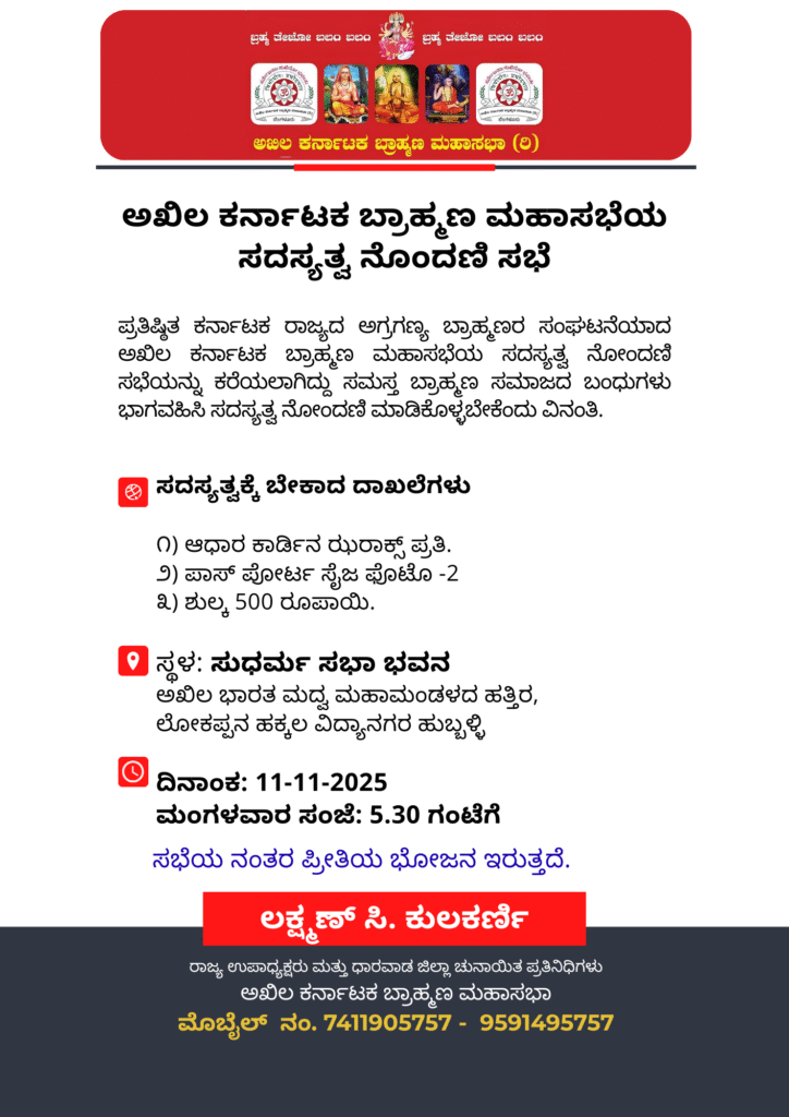 ಪ್ರತಿಷ್ಠಿತ ಕರ್ನಾಟಕ ರಾಜ್ಯದ ಅಗ್ರಗಣ್ಯ ಬ್ರಾಹ್ಮಣರ ಸಂಘಟನೆಯಾದ ಅಖಿಲ ಕರ್ನಾಟಕ ಬ್ರಾಹ್ಮಣ ಮಹಾಸಭೆಯ ಸದಸ್ಯತ್ವ ನೋಂದಣಿ ಸಭೆಯನ್ನು ಕರೆಯಲಾಗಿದ್ದು ಸಮಸ್ತ ಬ್ರಾಹ್ಮಣ ಸಮಾಜದ ಬಂಧುಗಳು ಭಾಗವಹಿಸಿ ಸದಸ್ಯತ್ವ ನೋಂದಣಿ ಮಾಡಿಕೊಳ್ಳಬೇಕೆಂದು ವಿನಂತಿ.